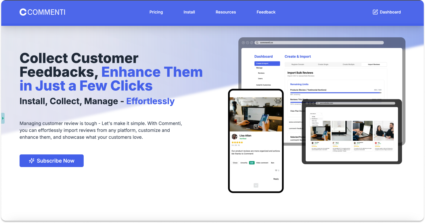 세 가지 이유로 Commenti 프로젝트를 시작했습니다. 첫째로, 실제 시장에서 경쟁할 수 있는 제품을 만들고 싶었습니다. 이전에는 학습을 위한 토이 프로젝트를 주로 진행했지만, 이번에는 검증된 시장에서 의미 있는 도전에 나서고자 했습니다. 둘째로, 1인 개발자가 감당할 수 있는 규모의 아이디어를 찾았습니다. 시장 조사를 통해 온라인 스토어들이 리뷰 시스템에서 겪는 문제—높은 가격, 설치 어려움, 성능 이슈—를 발견했고, 이를 해결하는 '쉽게 부착할 수 있는 리뷰 시스템'을 개발하기로 결정했습니다. 마지막으로, 실제 서비스를 만드는 전 과정을 경험하고 싶었습니다. 데이터베이스 설계부터 API 개발, Paypal을 이용한 결제와 인보이스 자동화까지 풀스택 개발을 경험했고, Shadow DOM 기반의 안전한 위젯을 구현했습니다. 이 과정에서 Supabase, Next.js, React, Vite 등 현대적인 기술 스택을 활용하여 서비스를 구축했습니다. 1인 개발자로서 기획부터 배포, 운영까지 전체 제품 개발 사이클을 경험할 수 있었습니다.